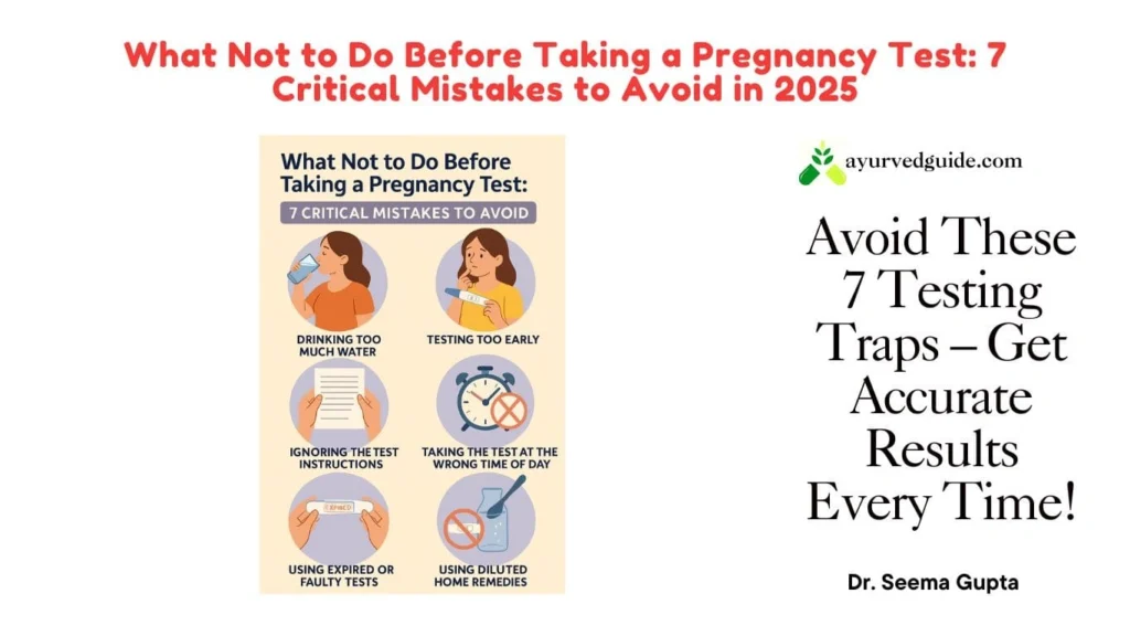 Avoid drinking too much water or fluids before a pregnancy test, as it can dilute hCG levels in urine and lead to a false negative. Also, avoid testing too early or ignoring instructions. Ayurveda advises a calm mind and early morning testing when ojas (vital energy) is high, to support clarity and accuracy.